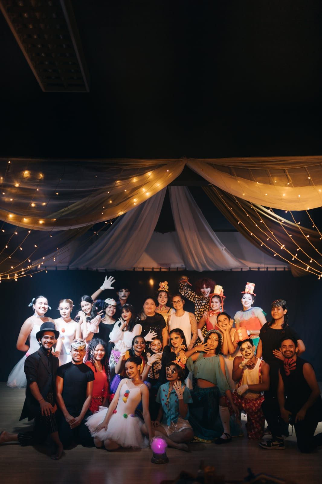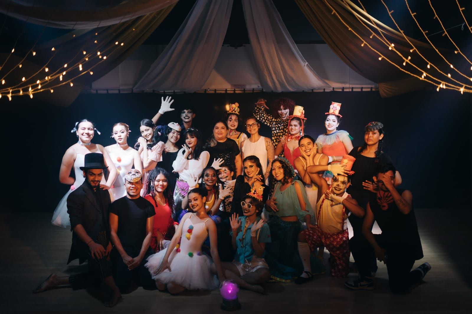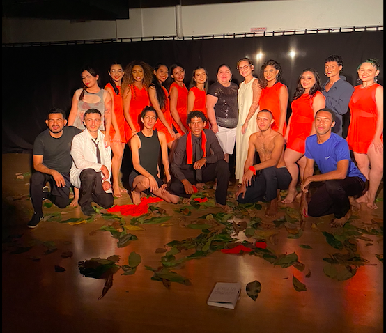 O coletivos dos alunosartistas do espetáculo "Oníricus" e as professoras Raíssa Costa e Carmem Arce. (2022)